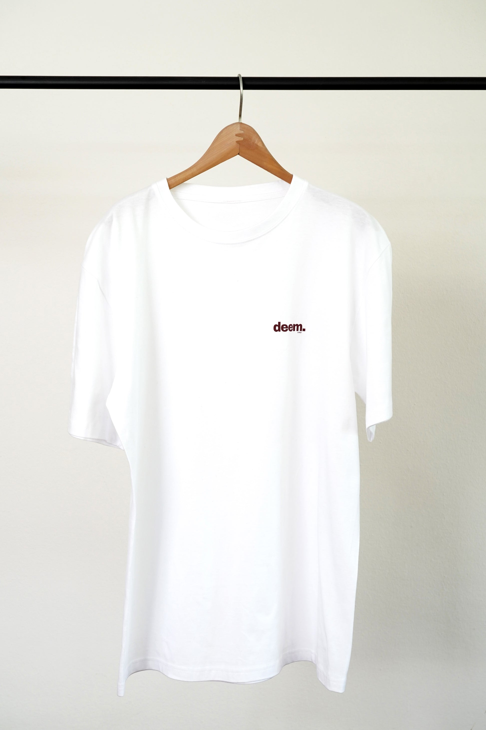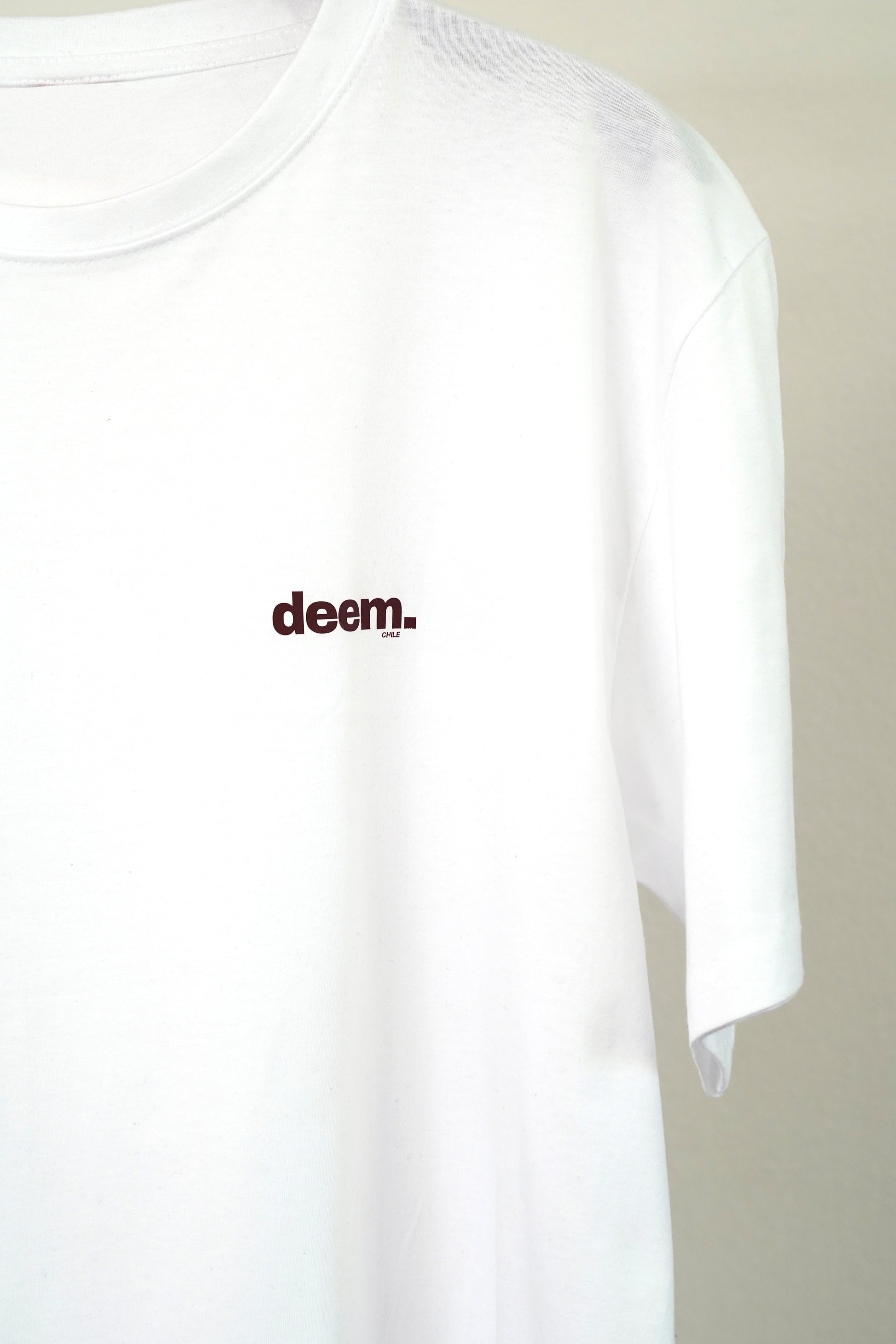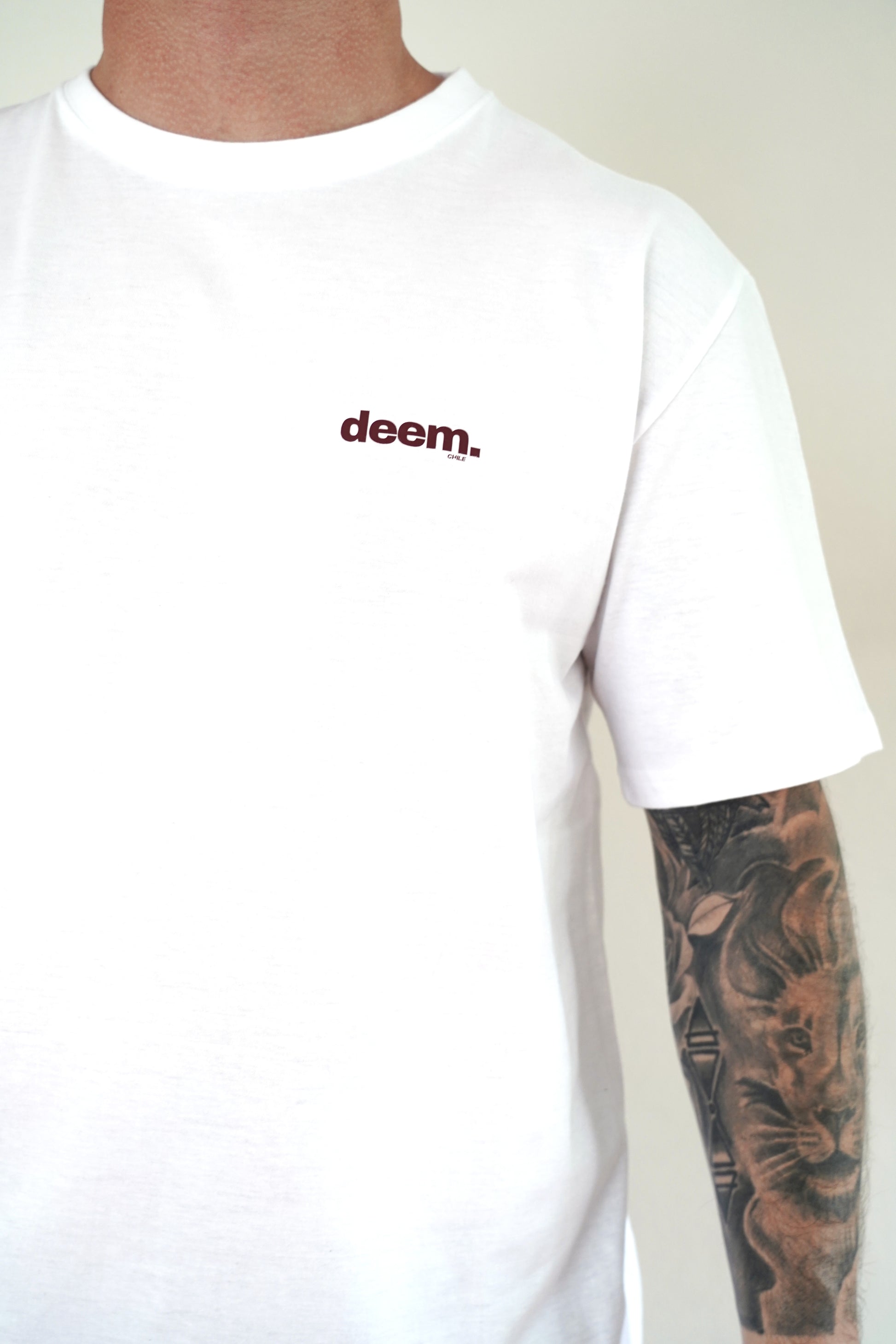 Polera 100% algodón, blanca, logo deem. burdeo: Diseñada con un corte elegante y minimalista, perfecta para quienes buscan estilo y confort en cualquier ocasión. Calidad premium que combina durabilidad y suavidad.