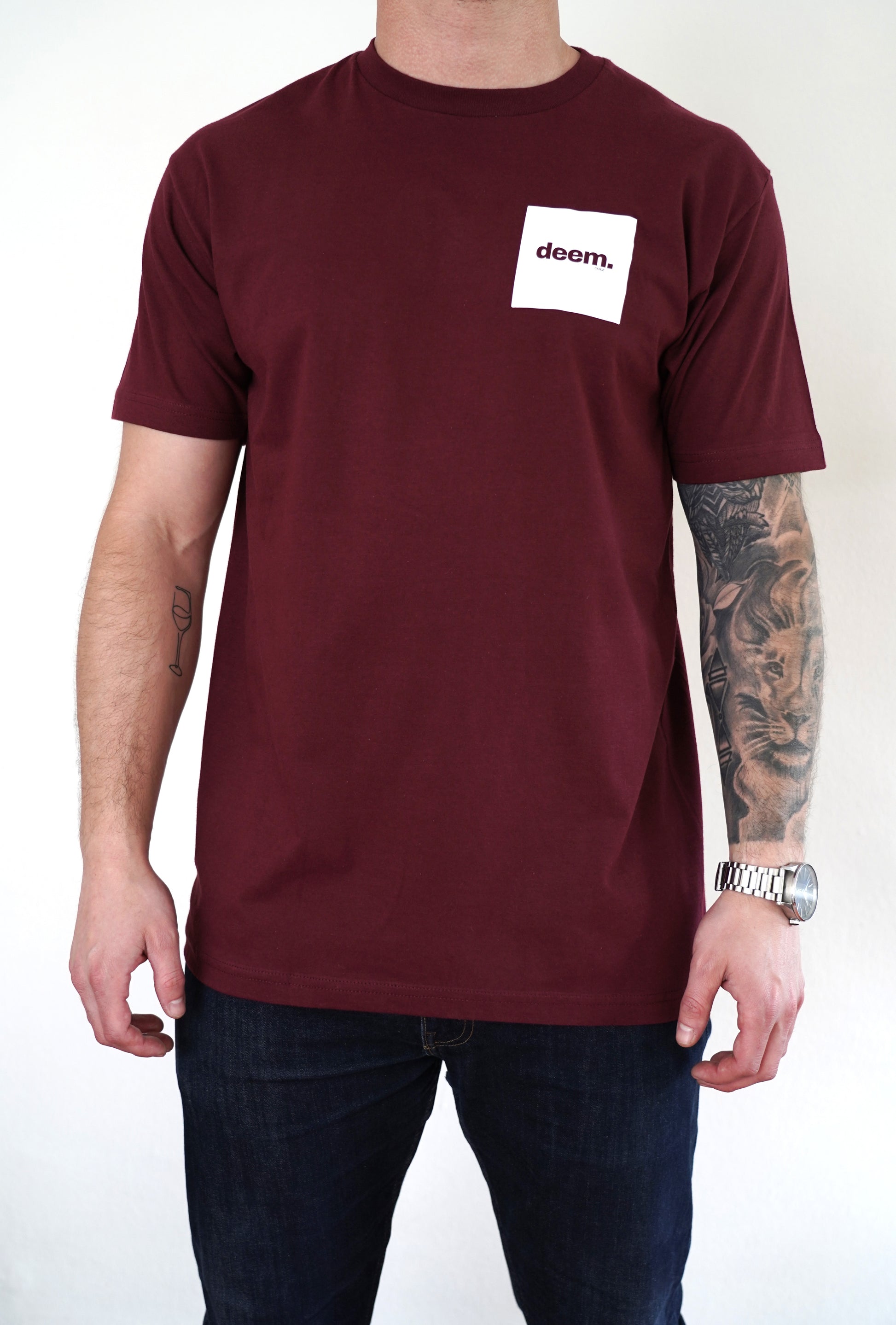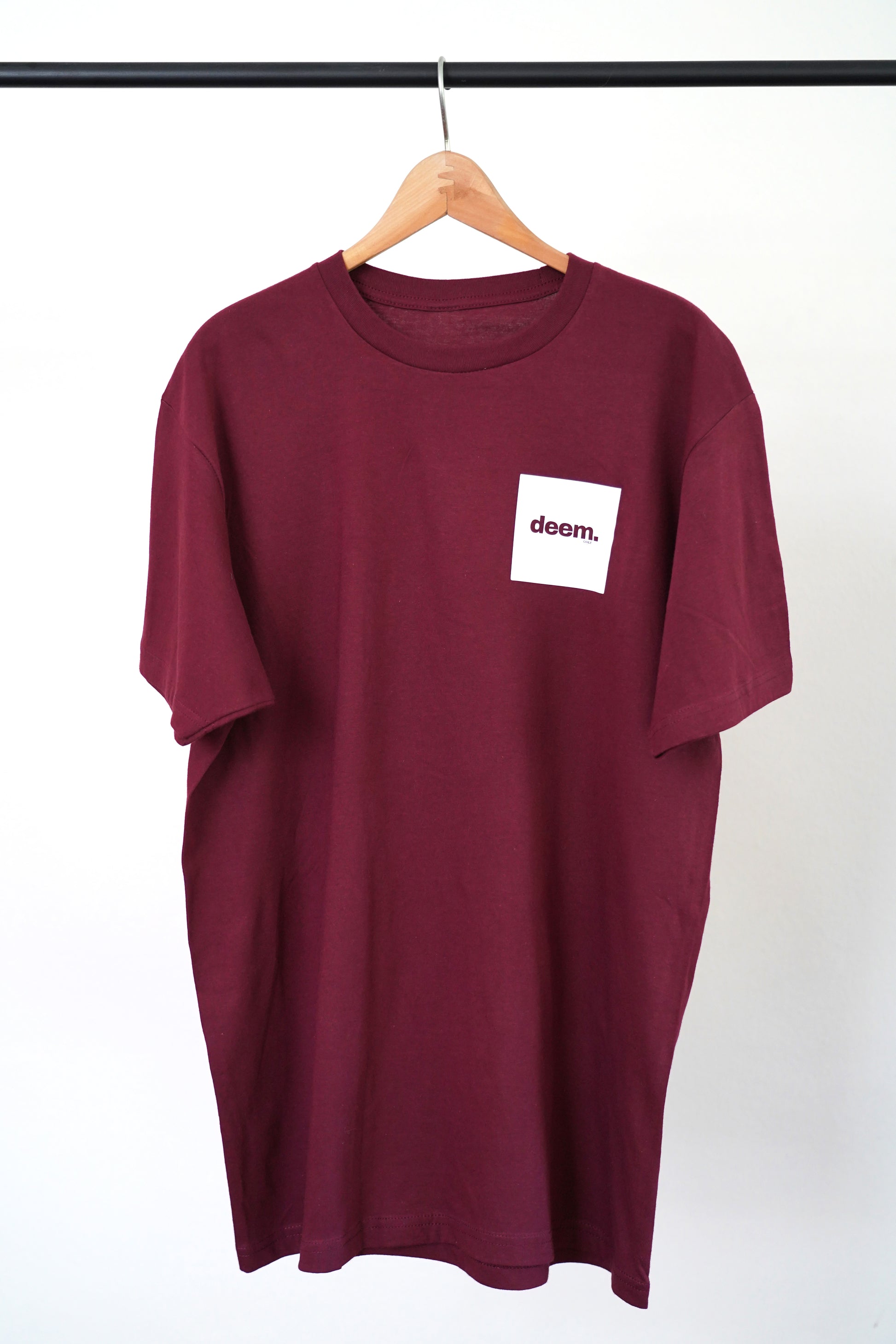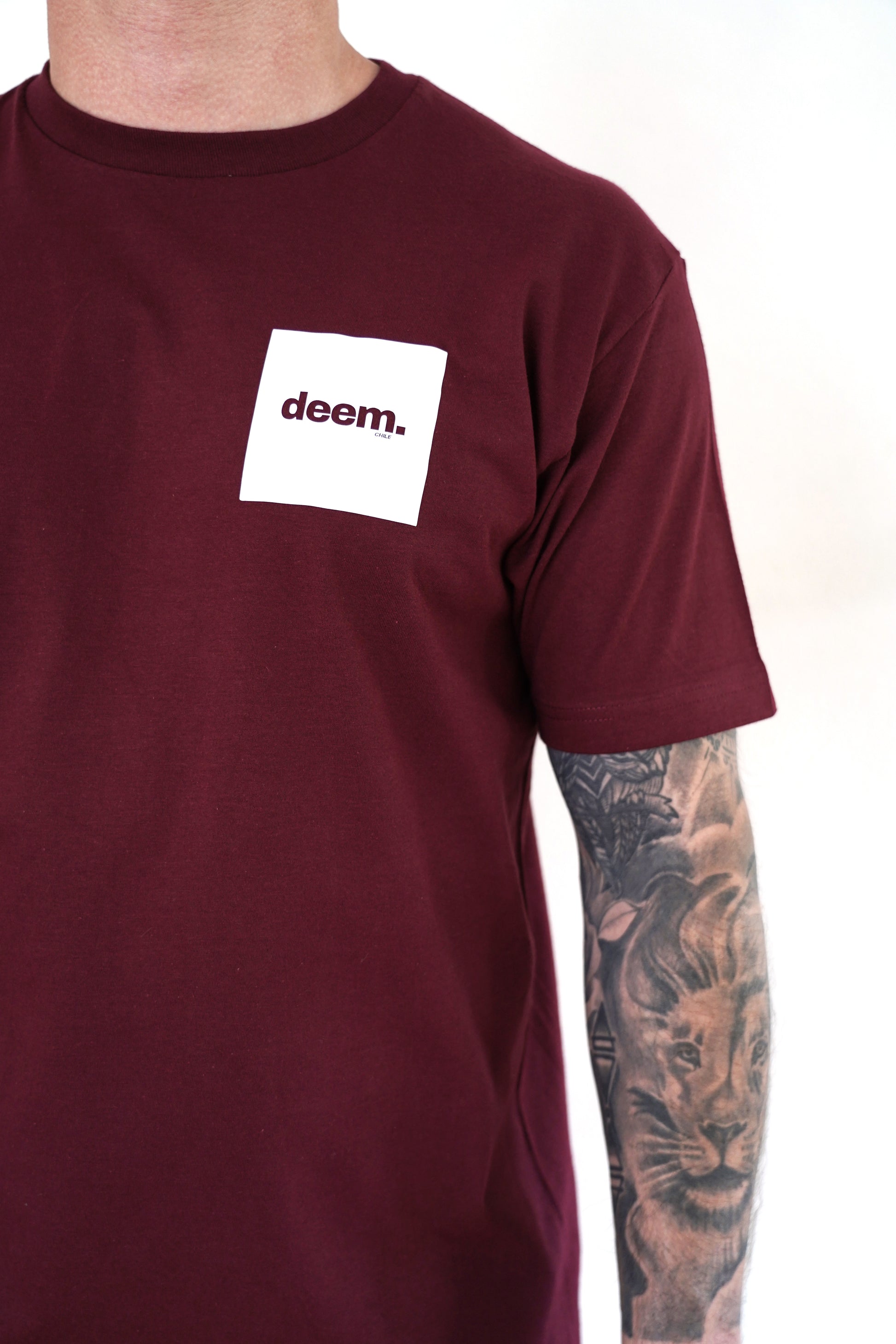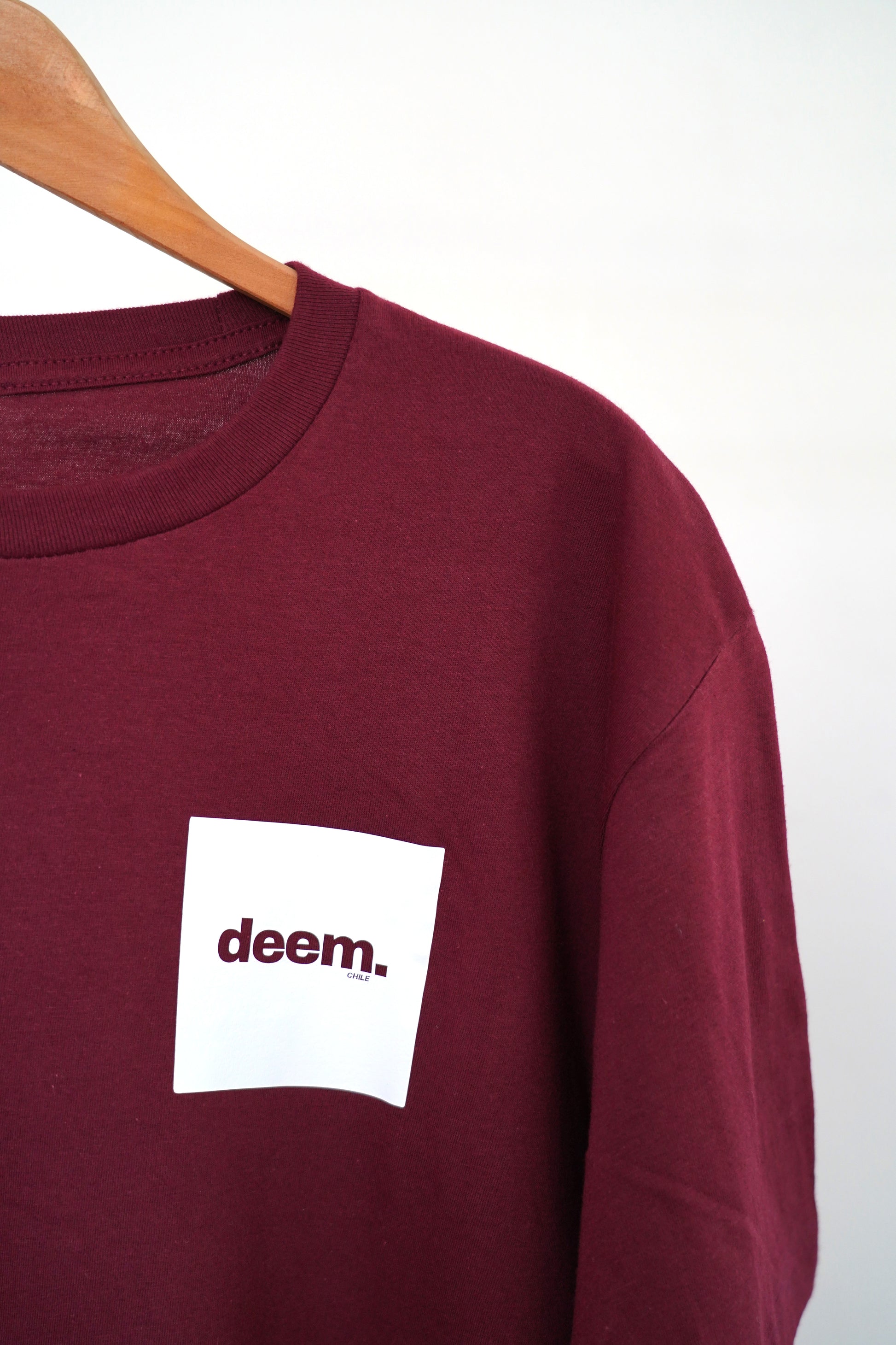 Polera 100% algodón, burdeo, logo deem. cuadrado blanco: Diseñada con un corte elegante y minimalista, perfecta para quienes buscan estilo y confort en cualquier ocasión. Calidad premium que combina durabilidad y suavidad.